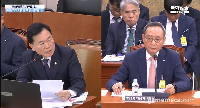 ▲ 국민의힘 김승수 의원(좌)와 게임위 서태건 위원장(우) (사진출처: 국회방송 국정감사 생중계 갈무리)