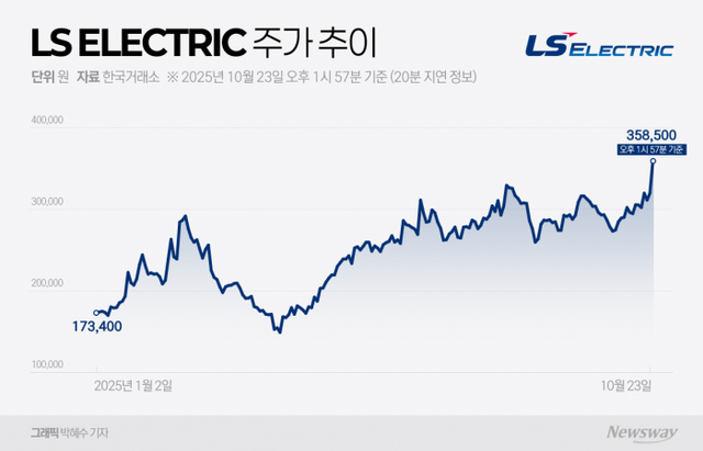 23일 한국거래소에 따르면 이날 오후 2시 39분 기준 LS ELECTRIC은 전 거래일 대비 13.46% 오른 36만2500원에 거래되고 있다. 같은날 12개 증권사가 목표주가를 상향 조정한 영향으로 장중 36만9000원까지 치솟았다. 올 초(1월 2일, 18만1000원)에 비해 100% 이상 오른 수준이다.