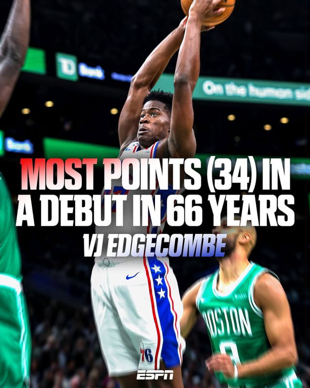 미국프로농구(NBA) 필라델피아 세븐티식서스 가드 V.J. 엣지콤(20)이 데뷔전에서만 34점을 몰아치며 르브론 제임스(LA레이커스), 앨런 아이버슨(은퇴)의 기록을 깨 눈길을 끌었다.