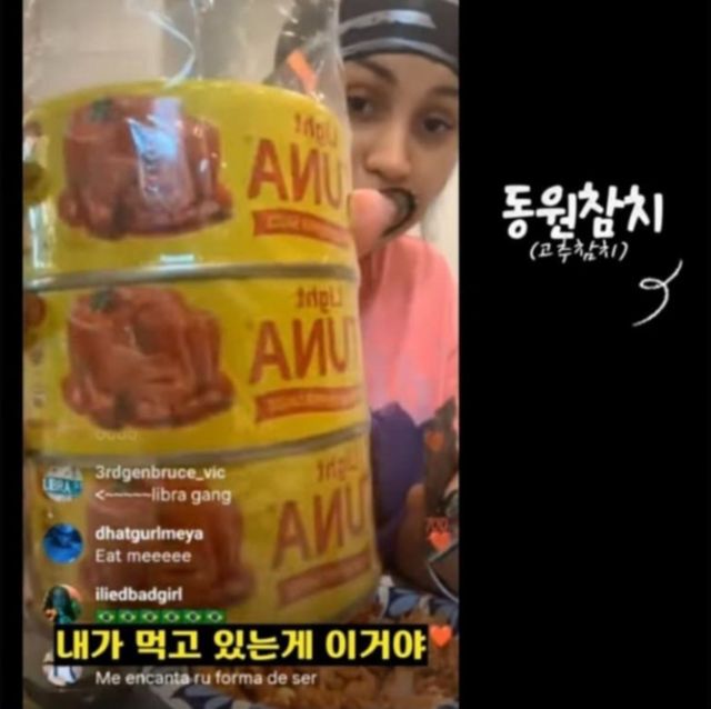 업계에 따르면 카디비는 인스타그램 라이브 방송에서 고추참치와 김을 활용해 직접 김밥을 만드는 모습을 보여줬다. 그는 캔을 열어 밥에 비빈 뒤 마요네즈를 곁들여 김에 싸 먹었고, “한국인들은 천재 같다”, “고추참치와 김의 조합은 완벽하다”고 말하며 감탄했다.
