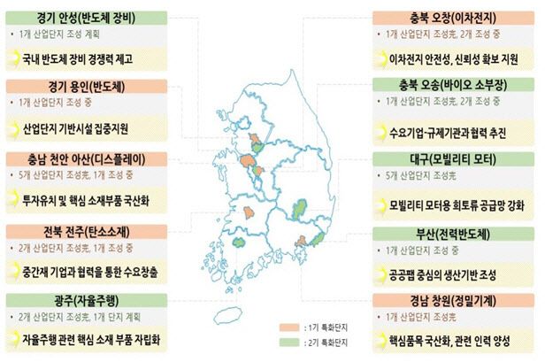 정부는 앞서 반도체, 디스플레이 등 첨단산업 공급망 불안에 대응해 2021년과 2023년 두 차례에 걸쳐 용인 반도체 소부장 특화단지와 청주 이차전지 소부장 특화단지 등 총 10곳을 지정해 육성했다. 이 과정에서 총 11조원의 민간투자가 이뤄졌고 반도체 원자층 증착 장비 등 15개 핵심기술도 확보했다.