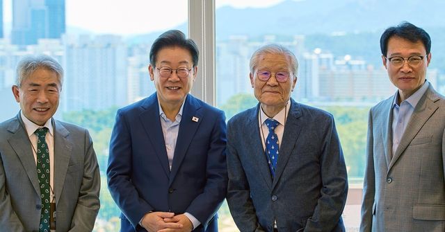 이재명 대통령이 7월 11일 서울 용산 대통령실 청사에서 열린 언론인 오찬 회동에서 참석자들과 기념 촬영을 하고 있다. 왼쪽부터 정규재 전 한국경제신문 주필, 이 대통령, 조갑제 조갑제닷컴 대표, 이규연 홍보소통수석. / 대통령실