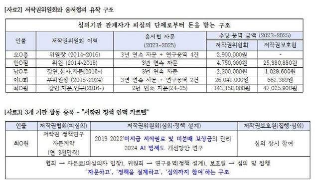 김재원 조국혁신당 의원도 음저협 내부 감사제도의 실효성과 이해충돌 의혹을 제기했다. 김 의원은 “특별감사 남발과 수당 반복 지급 등으로 감사제도가 사유화됐다”며 “심의를 받아야 하는 음저협이, 심의기관인 저작권위원회 전·현직 위원에게 자문료를 지급해 이해충돌 소지가 있다”고 말했다.