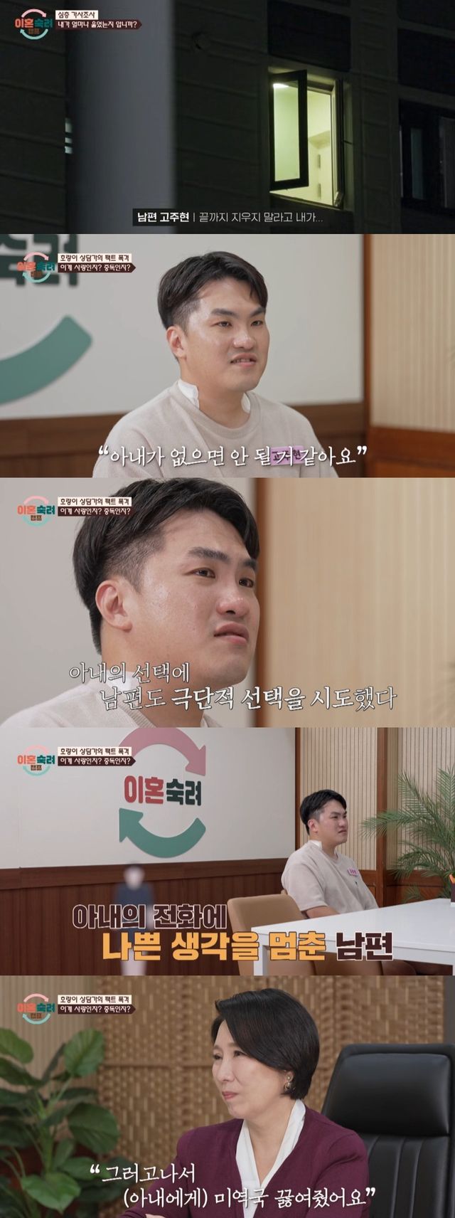 이들 부부는 이호선 부부를 만나 상담을 진행했다. 아내는 계속 남편과 같이 살고 싶다는 마음과 남편을 향한 애정을 솔직히 밝혔다.