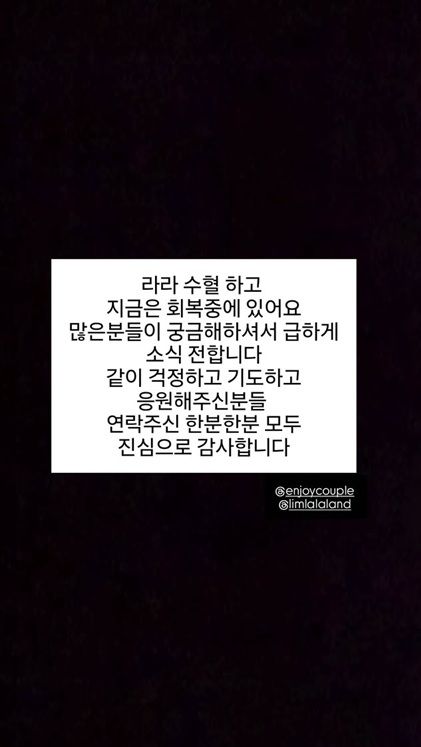 별다른 사진 없이 글만 게재한 손민수는 "라라 수혈하고 지금은 회복 중에 있다. 많은 분들이 궁금해하셔서 급하게 소식 전한다"고 전했다.