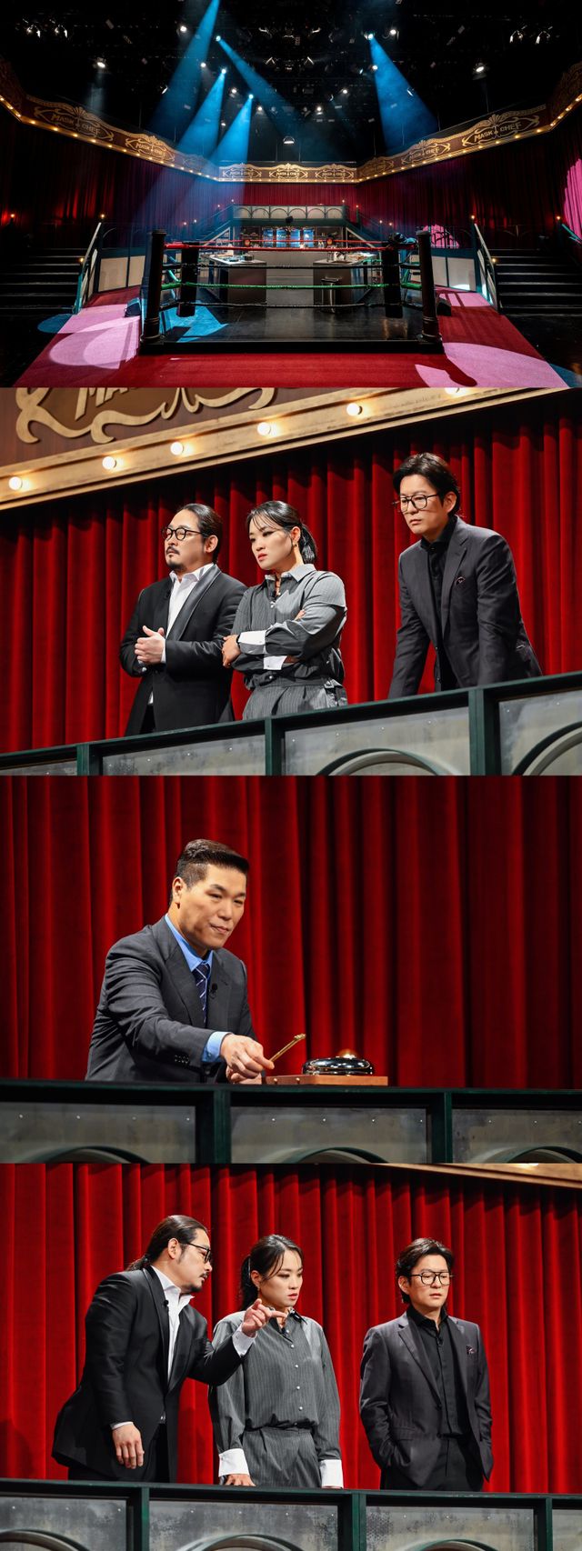 이런 가운데 MC 서장훈, 스타 셰프 강레오, 정지선, 김도윤의 긴장감 넘치는 첫 녹화 현장 스틸이 공개됐다. 가장 먼저 붉은빛 벨벳 커튼과 함께 금빛 장식으로 둘러싸인 스튜디오 중앙에 육각형 모양의 링이 눈에 띈다. 이는 보통의 요리 대결이 아님을 짐작게 하고, 링 안에 놓인 3개의 조리대는 어떤 대결이 펼쳐질지 호기심을 높인다.