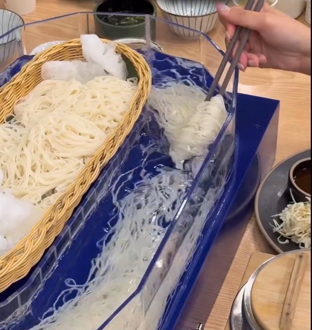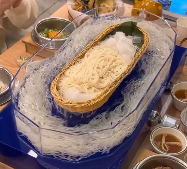 손님들은 "맛집이 있거든요!"라며 즐거워한다. 일본식 나가시소멘 문화를 현대적으로 재해석한 느낌이다.