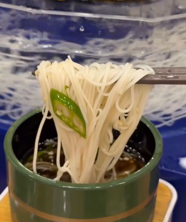 손님들은 젓가락으로 국수를 집어 회오리치는 물속에 담근 뒤, 낚시하듯 건져 올려 소스에 찍어 먹는다.