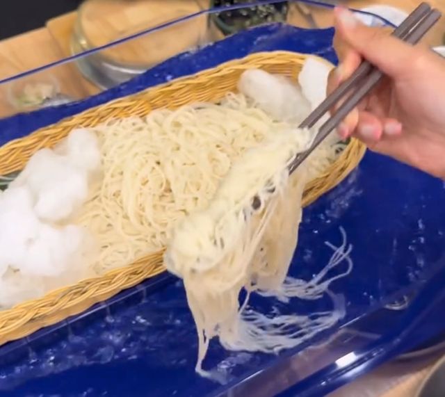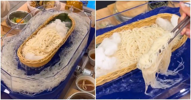 그 위에는 대나무 바구니가 놓여 있고, 살얼음으로 덮힌 탱글탱글한 소면이 담겨 있다.