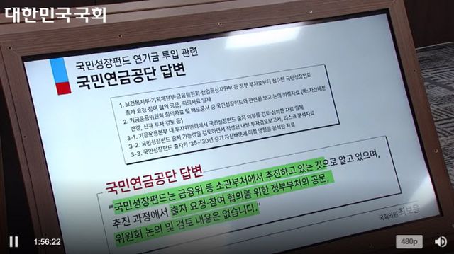 이어 “국민연금의 재정 상황을 보면 이런 대규모 정책펀드 참여는 더 신중해야 한다”며 “국민성장펀드 관련해서 정부 부처나 금융위원회로부터 출자 요청이나 협의 공문을 받은 적 있느냐”고 질의했다.