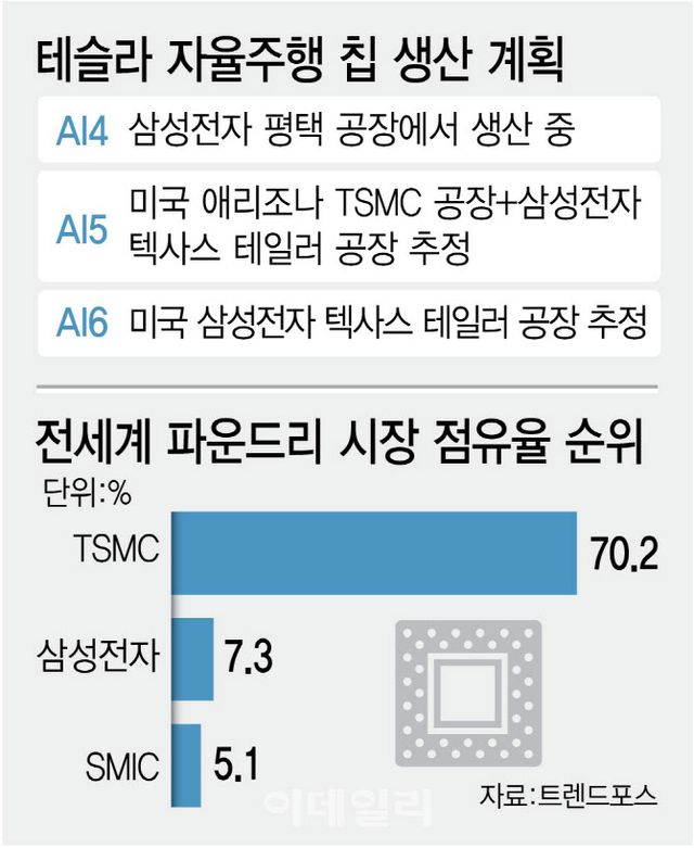 테슬라는 삼성전자와 AI4 칩을 생산하고 있고, AI5는 TSMC 미국 애리조나 공장에 맡길 계획이었으나 AI5를 삼성에도 맡기겠다고 했다. 가장 최신형 칩인 AI6는 내년 가동 예정인 삼성전자 미국 텍사스주 테일러 공장에서 2㎚(나노미터·1㎚는 10억분의 1m) 첨단 공정을 통해 만들 예정이다. 삼성전자 테일러 공장에서 AI5 칩도 생산할 것으로 관측된다.