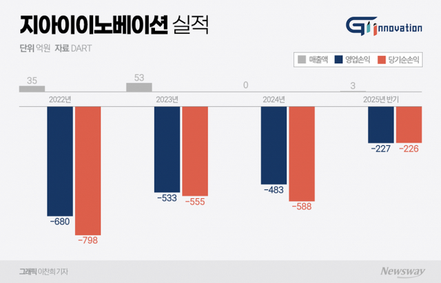24일 관련 업계에 따르면 지아이이노베이션은 지난 2023년 코스닥 기술특례로 상장했다. 상장 당시 제시한 2024년 매출은 1486억원, 영업이익 926억원이다. 하지만 실제 지난해 실적은 매출 2428만원, 영업손실 482억원을 기록했다. 목표 대비 매출은 0.0016%, 영업이익은 -52%라는 초라한 성적표를 받은 셈이다. 기술특례 상장사로서 최소한의 수익 창출 능력조차 입증하지 못했다는 지적이 나오면서 시장의 불신과 우려는 더욱 커지고 있다.
