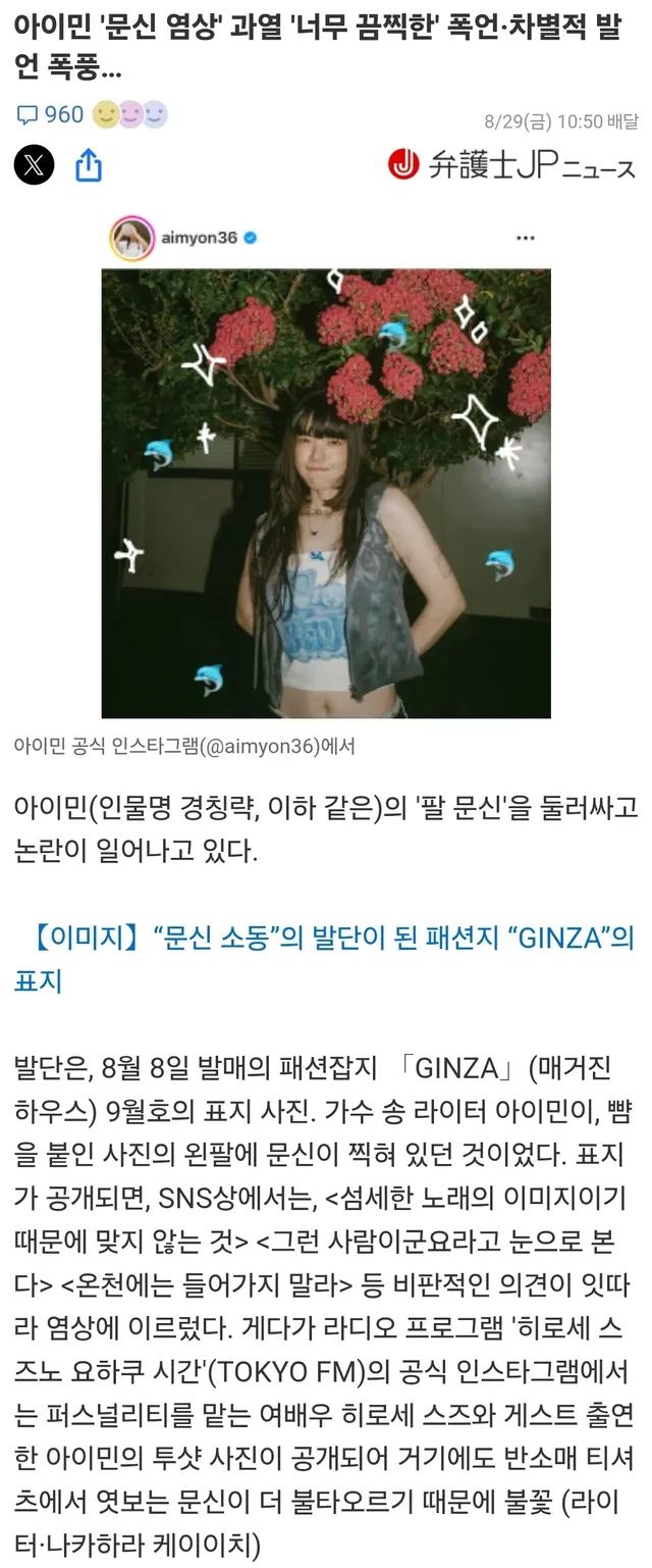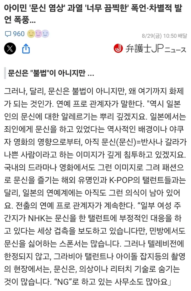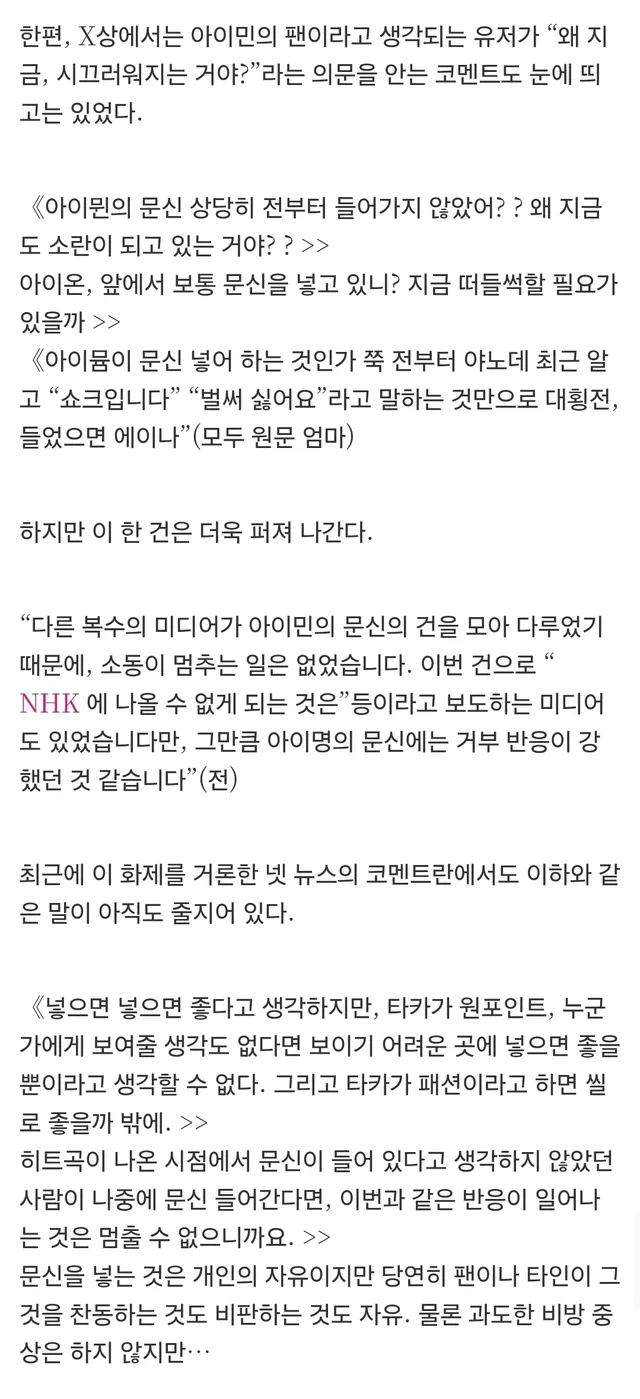 몇달 지난 지금까지도 타투로 물고뜯는 기사들 올라오는 중