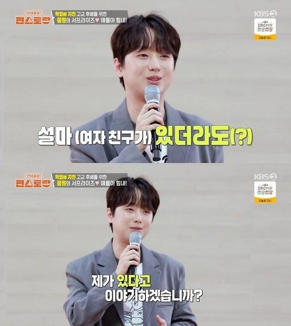 뉴시스 보도에 따르면, 이찬원은 24일 방송한 KBS 2TV '신상출시 편스토랑'에서 모교 후배로부터 "지금 여자친구 있느냐"는 질문을 받았다. 내가 있다고 얘기 하겠느냐. 설마 있더라도"라고 답했다. 분위기가 술렁이자, 이찬원은 "지금은 없다"고 덧붙였다.