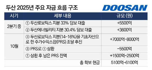여기에 두산은 이달 들어 두산로보틱스 지분 14~16%를 기초자산으로 한 7000억~8000억원 규모의 주가수익스와프(PRS) 계약을 추진 중이다. PRS는 보유 지분을 직접 매각하지 않고 해당 주식의 가격 변동에 따른 손익만 금융기관에 주는 파생금융상품으로, 지분율 희석 없이 현금을 확보할 수 있는 방법으로 각광받고 있다. 최근 SK, 롯데, 에코프로그룹 등이 보유 중인 자회사 지분을 활용한 PRS로 자금 마련에 나서고 있다.