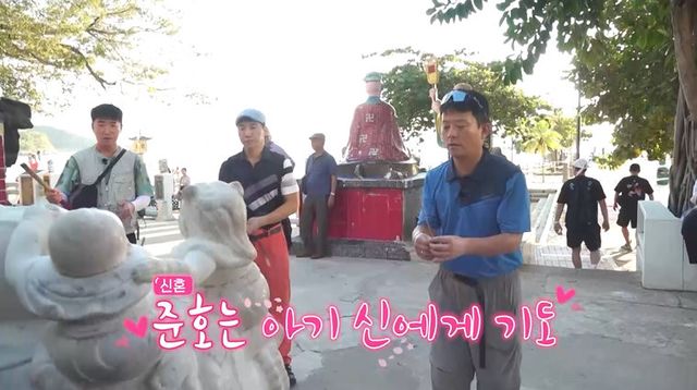 반면 ‘새신랑’ 김준호는 ‘아기 신’으로 통하는 ‘배불뚝이 상’ 앞으로 가서 “(2세가 생기도록) 잘 부탁드려요”라고 절절히 빌어 대비를 이룬다. ‘배불뚝이 상’을 만지면 아이가 생긴다는 말에 열심히 향을 피우며 두 손 모아 기도하는 것.