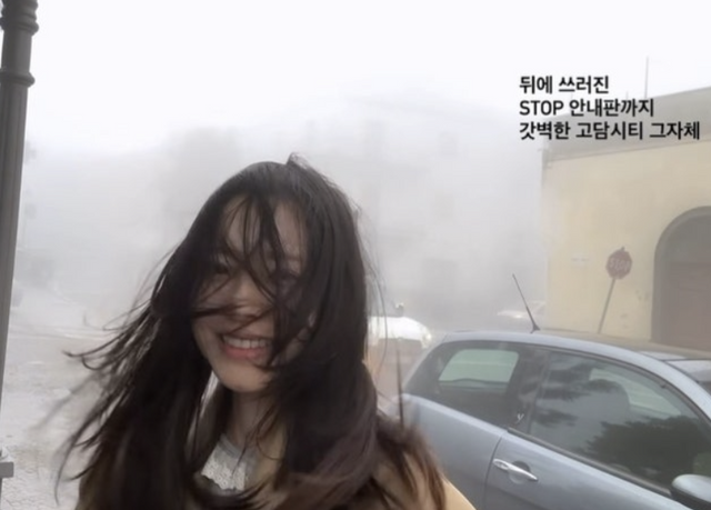 공개된 사진 속 그는 폭우와 짙은 안개 속 거리에 서있다. 이솔이의 머리도 산발이 되어 심각한 강풍을 짐작케 했다.