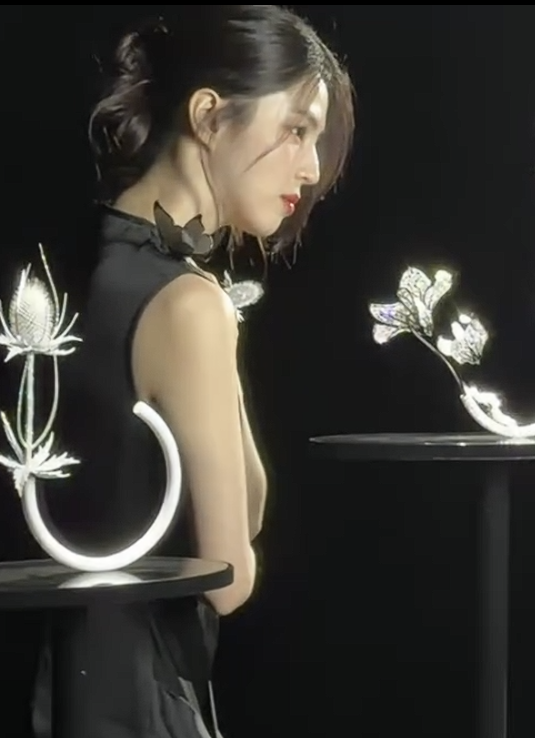공개된 사진 속 한소희는 블랙 슬리브리스 드레스를 입고 있다. 특히 어깨에 장식된 나비 디테일과 손끝의 화려한 주얼리가 어우러져 마치 한 송이 꽃처럼 빛나는 비주얼을 완성했다.