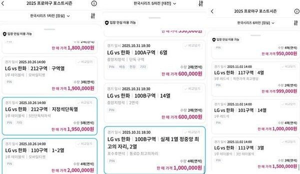 가장 높은 가격으로 제시된 좌석은 1차전 잠실야구장 기준 테이블석으로, 정가 12만원에서 약 16배 뛴 200만원에 판매되고 있었다. 이외에도 6차전 잠실야구장 기준 14만4000원인 테이블석도 약 10배 높은 150만원에 거래됐다. 5차전 대전 한화생명볼파크 기준 정가 15만6000원인 포수후면석도 6배 높은 100만원에 거래되고 있었다.