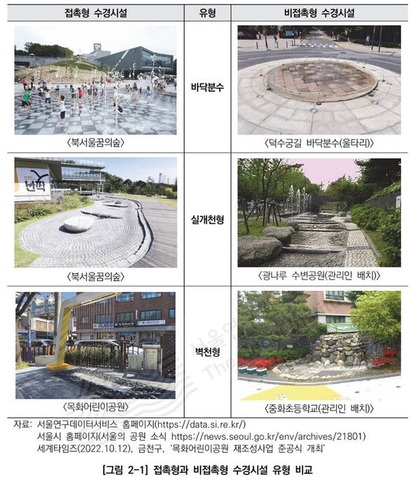 뉴시스 보도에 따르면, 26일 서울연구원에 따르면 서울시에서 관리하는 공공 수경 시설 595개 중 물놀이형(접촉형)이 263개소, 비접촉형이 332개소였다.