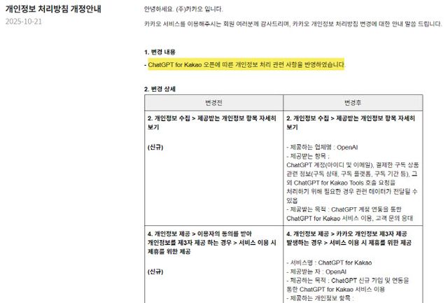 카카오는 이달말을 목표로 카카오톡에 챗GPT도 포함할 방침이다. 홈페이지에 올린 ‘개인정보 처리방침 개정안내’를 통해 10월 28일부터 ‘ChatGPT for Kakao’ 오픈에 따른 개인정보 처리 관련 사항을 반영했다고 밝혔다.