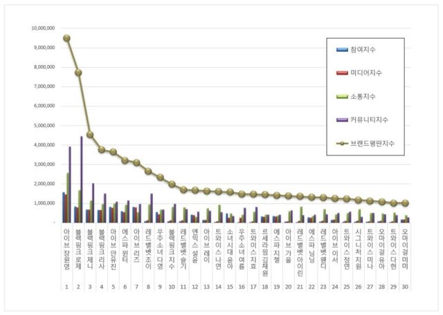2025년 10월 걸그룹 개인 브랜드평판 30위 순위는 아이브 장원영, 블랙핑크 로제, 블랙핑크 제니에 이어 블랙핑크 리사, 아이브 안유진, 에스파 윈터, 아이브 리즈, 레드벨벳 조이, 우주소녀 다영, 블랙핑크 지수, 레드벨벳 슬기, 엔믹스 설윤, 아이브 레이, 트와이스 나연, 소녀시대 윤아, 우주소녀 여름, 트와이스 지효, 르세라핌 김채원, 에스파 지젤, 아이브 가을, 레드벨벳 아이린, 에스파 닝닝, 레드벨벳 웬디, 아이브 이서, 트와이스 정연, 시그니처 지원, 트와이스 미나, 오마이걸 유아, 트와이스 다현, 오마이걸 미미 순으로 집계됐다.