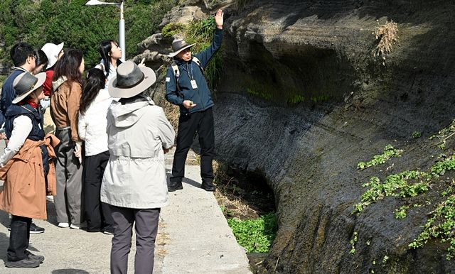 이날 정희준·이명숙 지질공원해설사와 함께 탐방객 10여 명은 수월봉 엉앙길 코스를 함께 걸었다. 이들은 남매 수월과 녹고의 슬픈 전설이 깃든 ‘녹고의 눈물’과 태평양 전쟁 당시 일본군이 만든 ‘갱도진지’, 수월봉 곳곳에서 볼 수 있는 화산재 지층과 화산탄 등을 둘러봤다.
