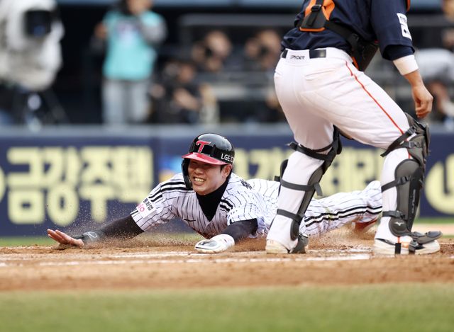 LG 트윈스가 다소 행운이 따른 추가 득점을 올렸다. 홈으로 쇄도하던 주자가 미끄러졌는데, 수비가 이를 보지 못했다. LG가 1점을 더 넉넉하게 달아났다.