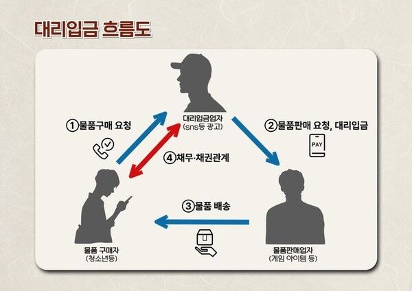 불법 대리입금이란 청소년을 대상으로 SNS 등을 통해 주로 10만원 내외의 게임 아이템 구입비, 연예인 굿즈나 콘서트 티켓 구입비 등을 대신 납부해 주고 '수고비', '지각비'를 부과하는 불법 대부 행위이다.