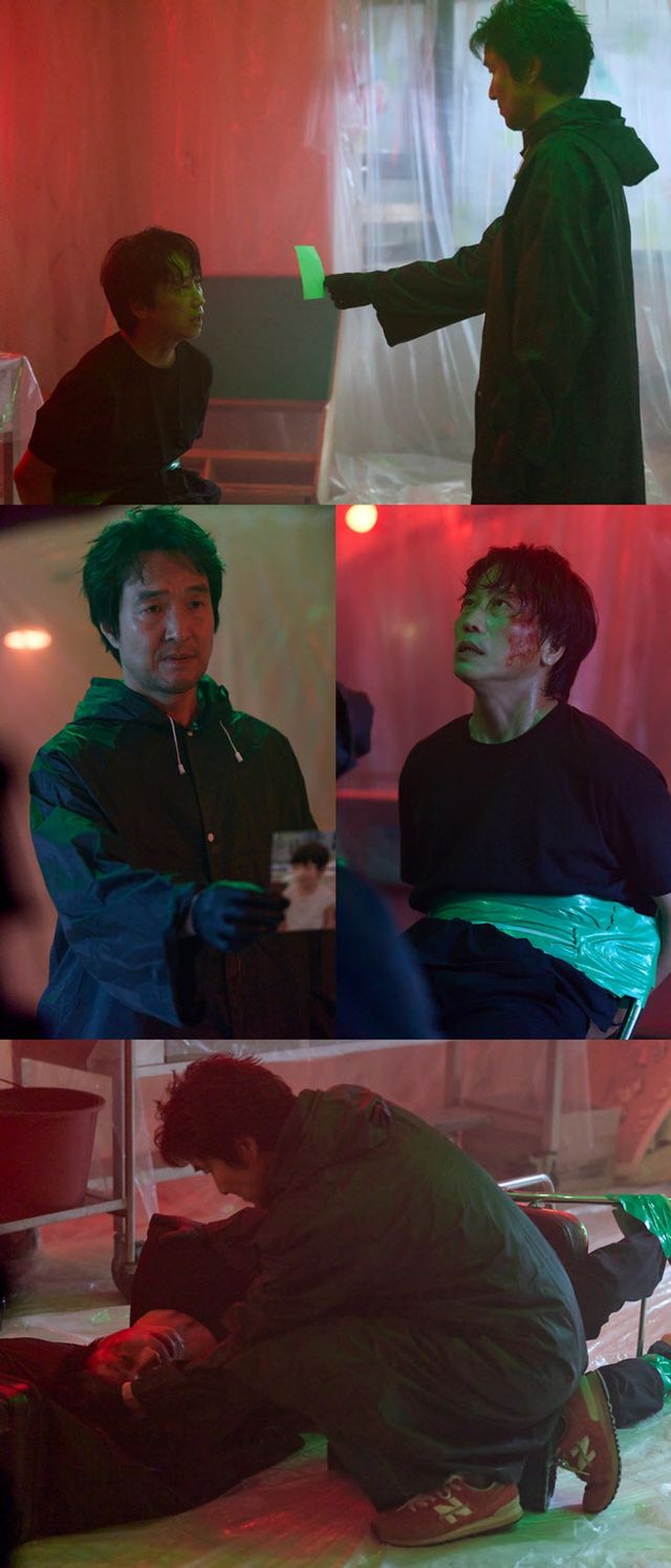 온몸이 결박된 채 피투성이 얼굴로 앉아 있는 윤동희의 초라한 행색 역시 사태의 심각성을 여실히 드러낸다. 무엇보다 신사장은 윤동희에게 아들이 왜 죽어야 했는지, 그날의 진실을 묻기 위해 매우 필사적이었던 터. 공포감이 짙게 드리운 심문의 시간 속 신사장이 윤동희에게 듣게 될 사건의 내막은 무엇일지 궁금증을 자아낸다.