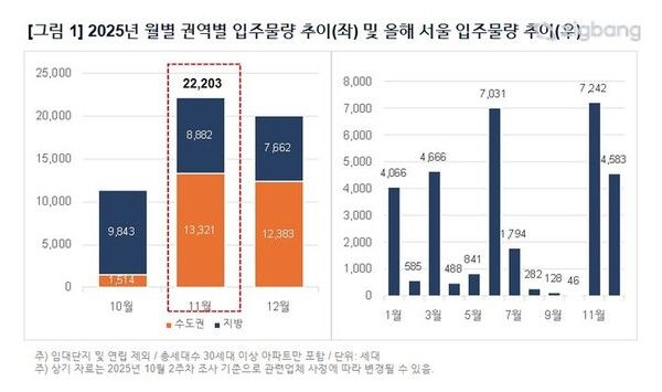 뉴시스 보도에 따르면, 27일 직방 조사에 따르면 오는 11월 전국 아파트 입주 물량은 총 2만2203가구로, 전월(1만1357가구) 대비 약 2배 증가하는 것으로 집계됐다. 12월까지 각각 2만가구 이상이 입주 예정으로, 한동안 부족했던 공급 여건에 숨통이 트일 것으로 기대된다.