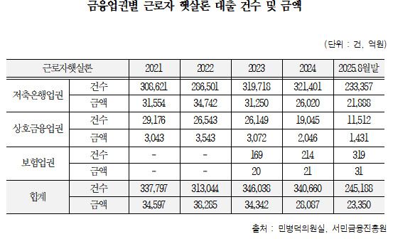 최근 5년간 근로자햇살론 대출 건수는 2021년 33만 7797건, 2022년 31만 3044건, 2023년 34만 6038건을 기록했으며 2024년에도 34만 660건으로 증가 추세를 이어갔다.