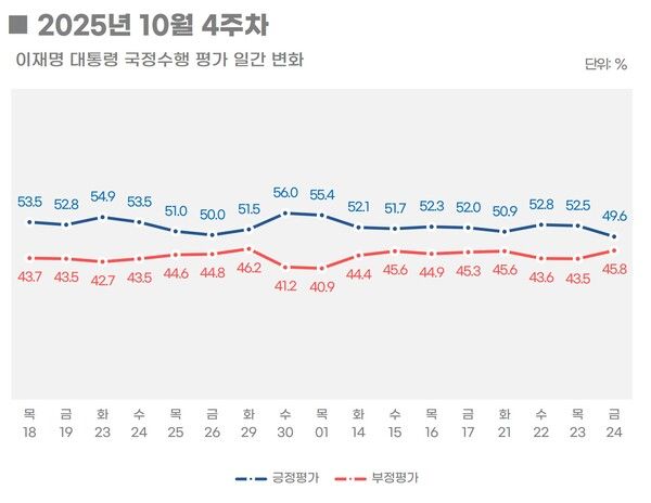 일간으로는 지난 금요일(17일) 52.0%(부정 평가 45.3%)로 마감한 후, 21일(화)에는 50.9%(1.1%P↓, 부정 평가 45.6%), 22일(수)에는 52.8%(1.9%P↑, 부정 평가 43.6%), 23일(목)에는 52.5%(0.3%P↓, 부정 평가 43.5%), 24일(금)에는 49.6%(2.9%P↓, 부정 평가 45.8%)로 나타났다.