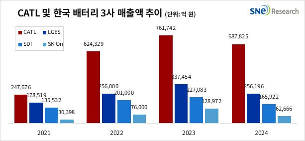 27일 시장조사업체 SNE리서치가 발간한 ‘중국 선두 제조사 경쟁력 분석 보고서’에 따르면 지난해 CATL의 매출은 3620억 위안(약 69조원)으로, 국내 배터리 3사 평균(약 16조원)의 4배를 넘었다.
