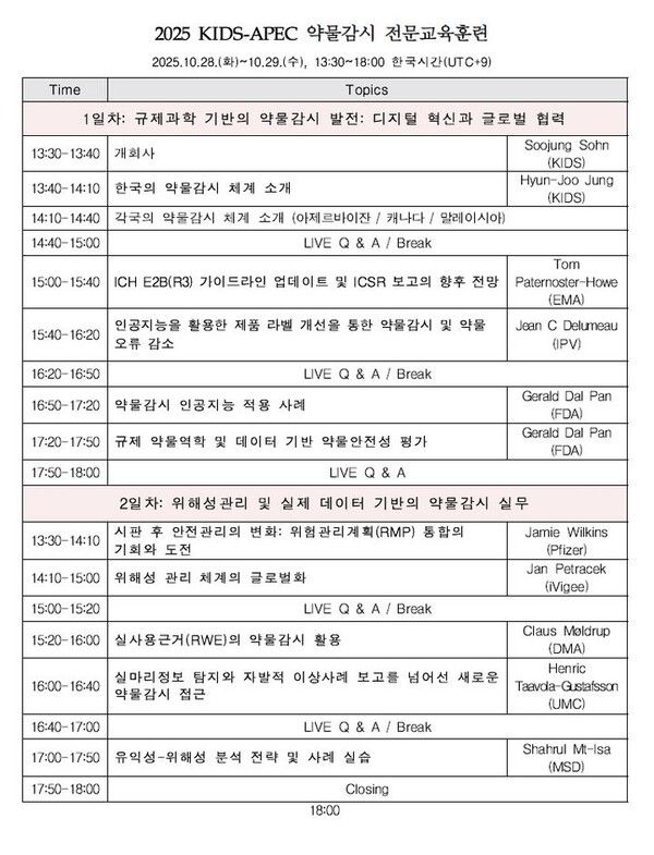 이번 교육에는 미국 식품의약국(FDA), 유럽의약품청(EMA), 웁살라 모니터링센터(WHO-UMC) 등 주요 국제기구 전문가들이 참여해 인공지능 및 디지털 기술을 반영한 최신 국제 동향을 공유한다.