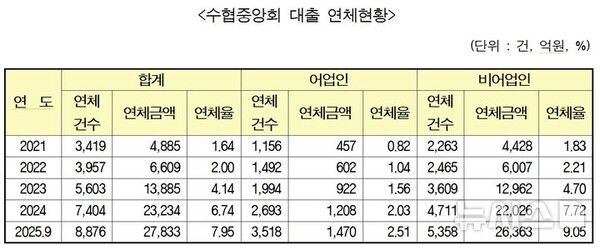 뉴시스 보도에 따르면, 27일 국회 농림축산식품해양수산위원회 소속 서전호 국민의힘 의원이 수협은행으로부터 제출받은 자료에 따르면, 연체 건수가 2021년 3419건에서 2025년 9월 기준 8876건으로 4년 새 5457건이 증가했다. 또 연체금액은 2021년 4885억원에서 2025년 9월 기준으로 2조7833억원으로, 같은 기간 2조2948억원이 증가한 것으로 집계됐다.