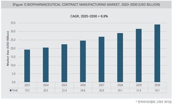 KBIOIS 브리프에 따르면 지난해 글로벌 바이오의약품 CMO 시장은 205억 달러(약 29조원)를 기록했다. 향후 6년간 연평균 8.8% 성장해 오는 2030년에는 341억 달러(약 49조원)를 나타낼 것으로 전망된다.