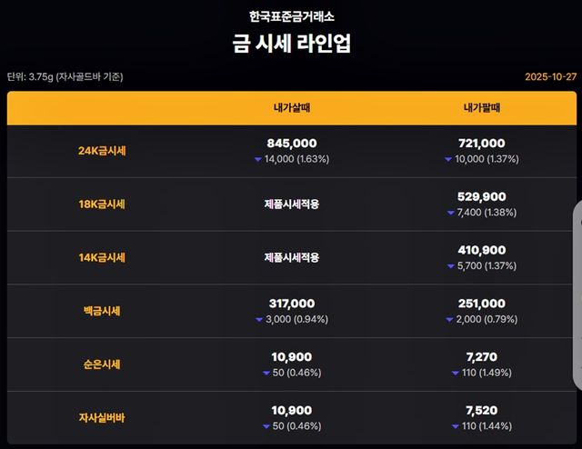 국내 금시세(금값)가 27일(한국 시각) 오후 하락세(전 거래일 대비)를 보이고 있다.