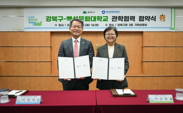 서울 강북구(구청장 이순희)는 지난 21일 강북구청 기획상황실에서 백석문화대학교(총장 이경직)와 '우수 인력 양성 및 지역사회 발전을 위한 관학 협력 협약'을 체결했다고 27일 밝혔다.