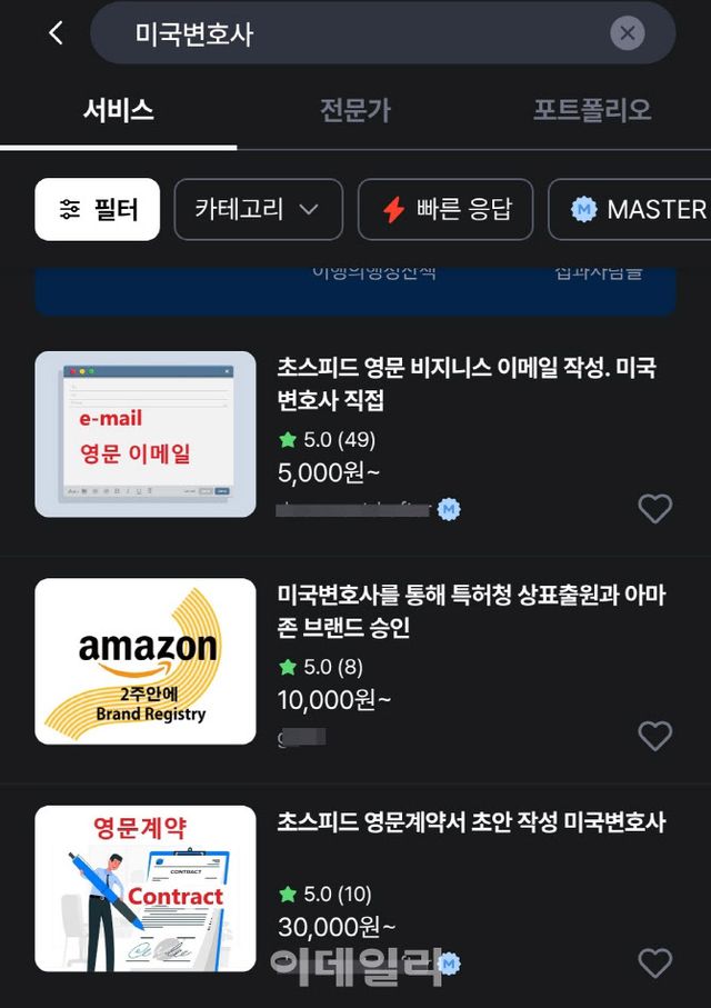 서울변회 직역수호센터는 최근 크몽에서 외국법자문사 등록 없이 유료로 법률사무를 수행하는 미국변호사가 있다는 신고를 다수 접수받았다. 센터가 즉각 사실관계 확인에 나선 결과, 여러 미국변호사가 전문가로 등록돼 활동 중이었고, 서비스 페이지에는 외국법자문사 등록 여부에 대한 확인이나 고지가 전혀 없는 것으로 드러났다.