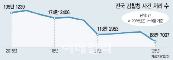 이른바 ‘3+1 특검’이 운영되는 초유의 특검 정국을 두고 법조계에서는 비판의 목소리가 크다. 이미 3대 특검에 파견된 검사 수만 최대 160명에 달하는데 또다시 검사와 수사관들을 파견하는 민생범죄 처리가 지연되고 있단 이유에서다. 실제 대검에 따르면 올해 1~9월 전국 검찰청에서 기소·불기소·보완수사 등 검찰이 처리한 사건 수는 88만 7007건으로 집계됐다. 월평균 9만 8556건 수준으로 지난해 검찰이 처리한 사건 수인 월평균 10만 2990건(연간 123만5881건)에 미치지 못하는 수준이다. 검찰 내부에서는 올해 처리 사건 수가 검·경 수사권 조정 직후인 2021년 113만 2953건에도 미치지 못해 최근 10년 만에 가장 적을 것이라 보고 있다.