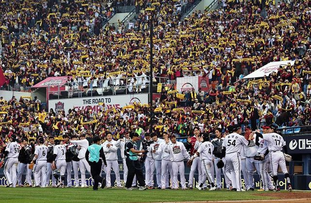 26일 서울 잠실야구장에서 열린 프로야구 2025 신한 SOL뱅크 KBO 포스트시즌 한국시리즈 1차전 한화 이글스와 LG 트윈스의 경기, 8대 2 승리를 거둔 LG 선수들이 승리의 기쁨을 나누고 있다. / 뉴스1