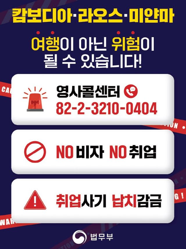 법무부 관계자는 “이번 확대 시행 조치는 라오스·미얀마에서도 발생할 수 있는 취업사기, 인신매매, 불법감금 등 각종 피해를 국민이 출국단계부터 위험성을 인지하고 피해를 사전에 예방할 수 있도록 하기 위한 것”이라고 설명했다.