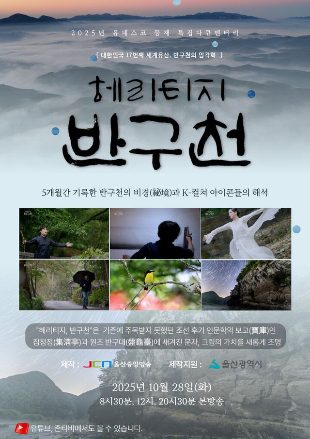 [이뉴스투데이 백연식 기자] JCN울산중앙방송은 ‘반구천의 암각화’ 유네스코 세계유산 등재(2025년 7월 12일, 대한민국 17번째)를 기념하는 특집 다큐멘터리 ‘헤리티지, 반구천’을 28일 첫 방송 한다.