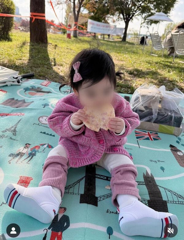 사진 속 재이 양은 핑크색 옷을 입고 뻥튀기를 먹으며 귀여운 매력을 뽐냈다.