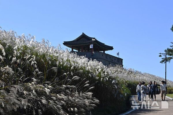 [서울=뉴시스] 화창한 날씨를 보인 27일 경기 수원시 화서공원을 찾은 시민들이 은빛 물결이 출렁이는 억새길을 거닐며 가을 정취를 만끽하고 있다.