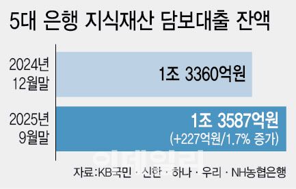 27일 금융권에 따르면 5대 은행(KB국민·신한·하나·우리·NH농협)의 지난 9월말 IP담보대출 잔액은 1조 3587억원으로 작년 말(1조 3360억원)에 비해 227억원 증가했다.