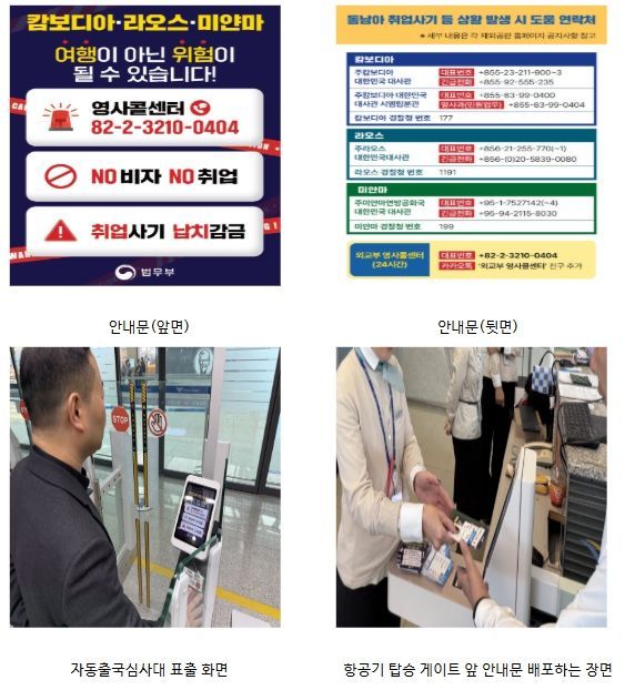 먼저 라오스·미얀마로 출국하는 국민이 법무부 자동출국심사대를 통과할 경우, 모니터 화면에 안내 문구나 영상이 표출되어 취업사기 등 위험에 대한 경각심을 높일 수 있도록 시각적 안내가 이루어진다.