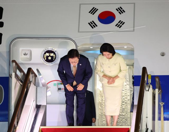 이 대통령과 김혜경 여사는 이날 오후 11시 16분께 공군 1호기에서 내려 허리를 숙여 인사했다. 도열해 있던 인사들은 박수로 환영했다.