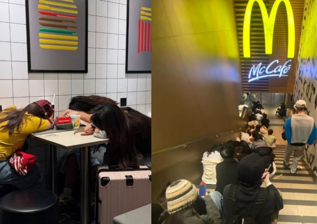 특히 숙박비를 줄이기 위해 24시간 영업하는 맥도날드나 KFC 등 패스트푸드 매장에서 밤을 새우는 사례가 늘고 있다. 일부 관광객들은 매장 내 식탁 위나 계단에 누워 잠을 청하는 모습까지 공개됐다.